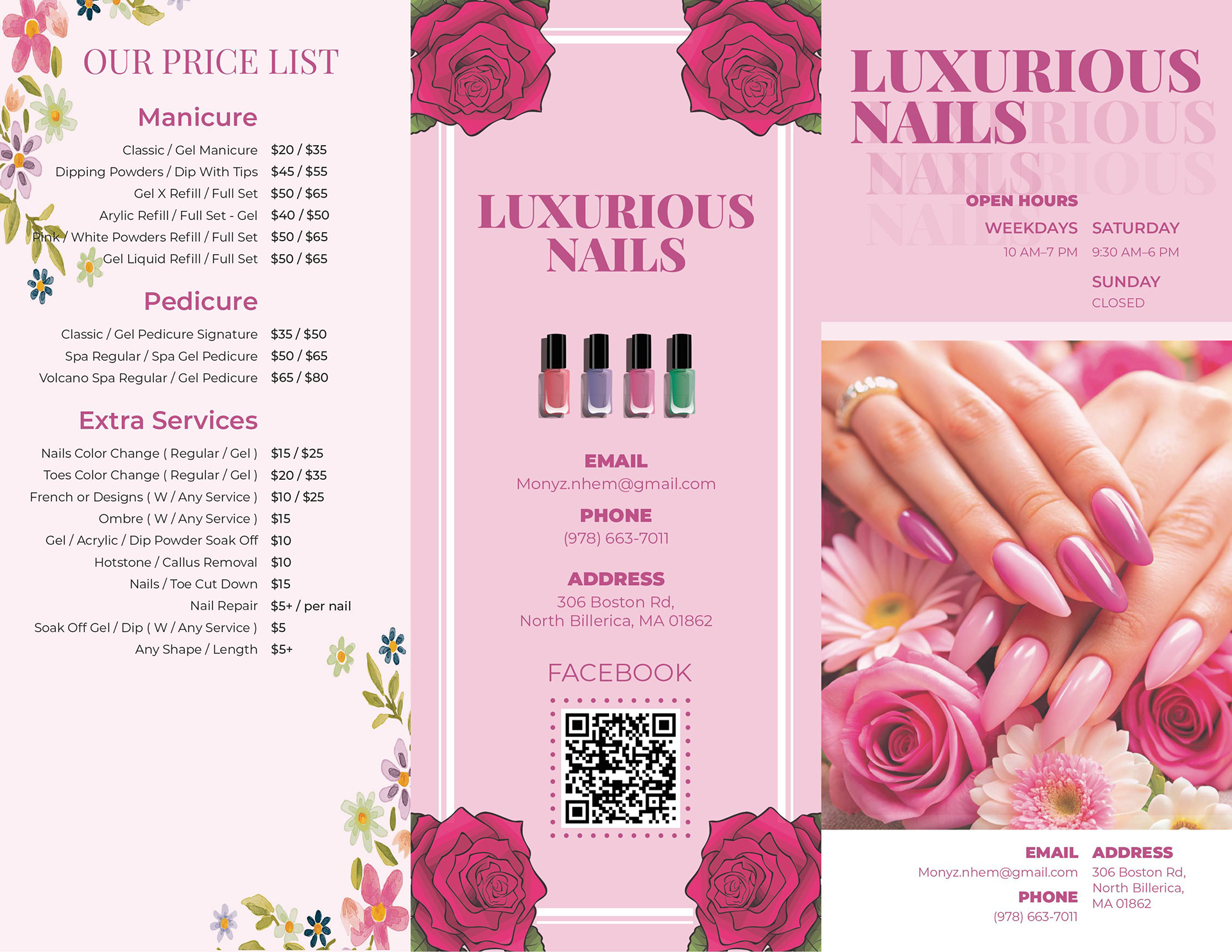 Project Description: This freelance project focused on establishing brand cohesiveness and organizing information clearly for a nail salon. The goal was to design materials that allow customers to easily access and understand the salon’s services and procedures. The final design combined a visually appealing beauty aesthetic with the salon’s atmosphere to convey a sense of warmth, professionalism, and authenticity.